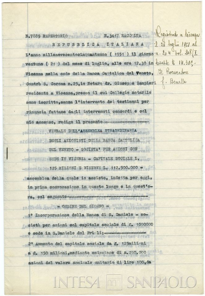 La Banca di San Daniele del Friuli (dal 1930 Banca di San Daniele) si costituì il 28 ottobre 1921 come società anonima per azioni. Secondo lo statuto del 1946, scopo della società era quello di "provvedere al credito, coadiuvare il commercio, l'industria e l'agricoltura" (art. 2). Gli utili erano così ripartiti: il 20% alla riserva, il 60% agli azionisti, il 15% al Consiglio di amministrazione, il 5% "a disposizione del Consiglio per erogazioni a scopi assistenziali e di incoraggiamento di pubbliche istituzioni" (art. 13). Il 18 luglio 1951 fu approvata l'incorporazione nella Banca Cattolica del Veneto, motivata dall'amministrazione con il "crescente carico degli oneri di gestione" e la "inadeguatezza dei mezzi disponibili rispetto alle esigenze della clientela". Non potendosi attuare un aumento di capitale si optò per un accordo con la Banca Cattolica del Veneto che, "già presente in San Daniele del Friuli con un'avviata filiale", avrebbe potuto continuare a sviluppare, a seguito della fusione, l'attività creditizia "onorevolmente svolta" fino a quel momento dalla Banca di San Daniele, "avvalendosi di una maggior larghezza di mezzi finanziari e tecnici".