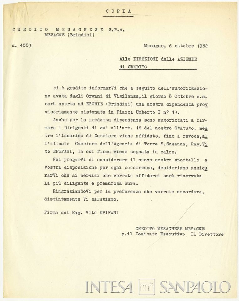 - Archivio Storico della Banca Italia, fondo 4 Ispettorato del credito, sottofondo 1 Ispettorato del Credito, prat. n. 918, fasc. 3 Credito Mesagnese - Mesagne - Brindisi;