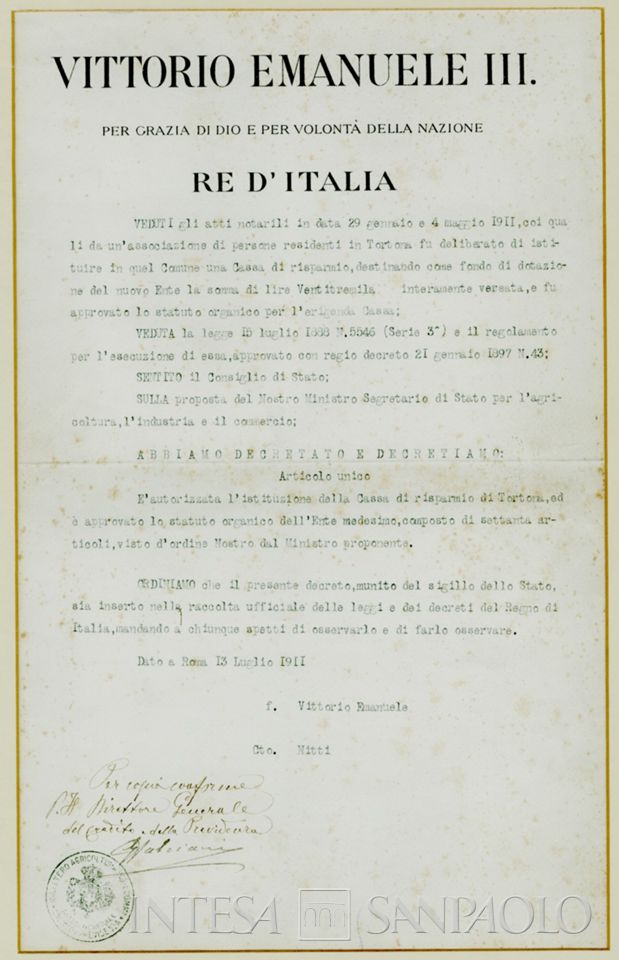 La Cassa di Risparmio di Tortona venne costituita per iniziativa della Società per gli studi di storia, d'economia e d'arte nel Tortonese (poi Pro Julia Dertona) col concorso del Comune, della Congregazione di Carità, di benemeriti cittadini ed altri enti morali, con un fondo di dotazione di lire 23.000. Autorizzata con regio decreto 13 luglio 1911, aprì gli sportelli al pubblico l'11 dicembre dello stesso anno. Ad un avvio lento e difficoltoso seguì negli anni Venti una progressiva crescita operativa.
