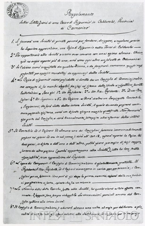 La costituzione della Cassa di Risparmio di Caldarola venne promossa dalla Magistratura della città nell'aprile 1847, dietro l'impulso del priore comunale Raffaele Betti e del componente più anziano della Magistratura, Fiorenzo Grifi, poi nominato primo presidente della Cassa di Risparmio. In questo modo la città aderiva al sollecito del delegato apostolico di Camerino, Monsignor Ferraguti, che chiedeva di promuovere nella zona sotto la sua autorità la fondazione di questa tipologia di istituti di credito prendendo a modello l'esperienza della Cassa di Risparmio camerinese. Il capitale iniziale fu di scudi 600, costituito da 30 azioni da 20 scudi ciascuna, cinque delle quali sottoscritte dalla Magistratura con delibera del 18 marzo 1858. Il regolamento ebbe l'approvazione regia il 9 novembre 1859 e gli sportelli furono aperti il 9 marzo 1860. Per i primi trenta anni i depositi a risparmio crebbero in maniera costante. Nell'attività di reinvestimento, circoscritta nei confini della città, furono prevalenti le operazioni cambiarie; tuttavia non mancarono finanziamenti ad iniziative economiche locali, specie alla Società operaia, anche con premi d'incoraggiamento alla costituzione di fabbricati cooperativi. Dal 1865 iniziarono le erogazioni di parte degli utili in beneficenza. Nel 1892, in seguito al fallimento di alcune aziende locali, la Cassa di Risparmio registrò un aumento notevole delle sofferenze, poi ridotte dall'anno successivo. I dissesti dell'economia locale incisero nuovamente sul suo andamento nei primi anni del nuovo secolo. Una ripresa positiva nell'operatività si registrò dal 1904, anno nel quale si avviò una fase di consolidamento che si mantenne fino al 1910. Nel frattempo, furono introdotte modifiche allo statuto nel 1891, 1896 e 1904; a quest'ultimo anno risale l'acquisto del fabbricato del vecchio ospedale della città per adibirlo ad uso uffici. L'andamento della Cassa risentì dell'impatto del primo conflitto mondiale e della lenta ripresa dell'economia locale nel dopoguerra. Dal 1924, inoltre, si registrarono rilevanti sofferenze nei crediti erogati. In seguito alle disposizioni governative di accorpamento delle casse di risparmio minori in casse di risparmio circonvicine di dimensioni maggiori (regio decreto legge 10 febbraio 1926, n. 26, convertito in legge 29 dicembre 1927, n. 2586), su proposta del ministro dell'Economia Nazionale, la Cassa di Risparmio di Caldarola fu incorporata nella Cassa di Risparmio di Tolentino per regio decreto 19 agosto 1927, n. 1603 (in vigore dal 4 ottobre 1927).