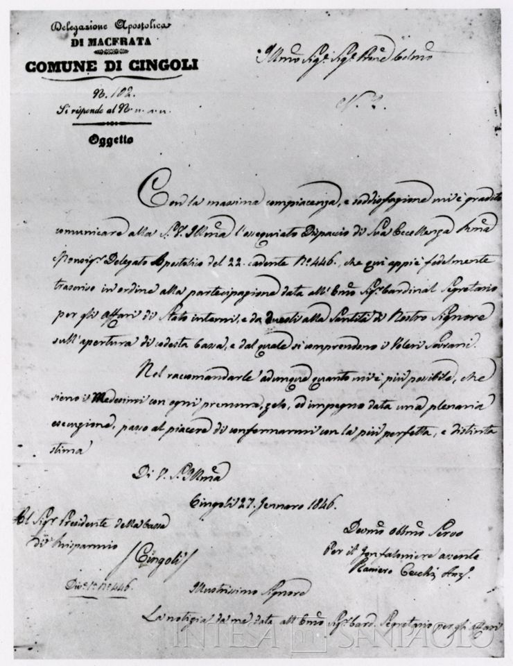 La Cassa di Risparmio di Cingoli venne costituita nei primi mesi del 1844 dalla Magistratura della Città, su stimolo di Don Giovanni Fenizi, mansionario della Cattedrale cittadina, che aveva raccolto l'adesione di alcuni possidenti sull'opportunità di fondare, sull'esempio positivo delle esperienze in altre città limitrofe, un istituto di credito che sollevasse la zona dal problema dell'usura. Il capitale venne costituito con la sottoscrizione di 90 azioni del valore di scudi 10 ciascuna. Nella adunanza del 13 luglio 1844 venne approvato il regolamento (redatto su modello di quello della Cassa di Risparmio di Bagnocavallo) e venne eletto il primo Consiglio di Amministrazione, che aveva tra i suoi componenti personalità dell'aristocrazia e delle più note famiglie di Cingoli. Tratto distintivo dello statuto era l'obbligo di versamento dei depositi ricevuti nel locale Monte di Pietà. La Cassa di Risparmio ebbe la sanzione sovrana il 19 luglio 1845 e il successivo 21 dicembre iniziò la propria attività in stanze concesse in fitto da Pacifico Giannobi. L'andamento della Cassa fu influenzato dalla congiuntura dell'economia locale e nazionale. Dagli anni '60 iniziò una lenta ascesa della sua attività: vennero concessi premi ai depositanti più diligenti e di più modesta condizione e dal 1870 iniziarono le erogazioni in beneficenza destinate in particolare all'ospedale e all'asilo di infanzia. Negli ultimi due decenni dell'800 furono introdotte delle modifiche allo statuto (1898) sia per adeguarlo alle nuove disposizioni riguardanti il credito fondiario (legge 23 gennaio 1887) e le casse di risparmio (legge 15 luglio 1888, n. 5546) sia per migliorare la sua operatività. Fu quindi istituito un apposito fondo per erogare mutui speciali agli agricoltori; inoltre vennero introdotte restrizioni nei periodi di tolleranza alle scadenze delle cambiali, dato che in passato, per la gestione 'bonaria' e familiare della Cassa, si era abusato in facili rinnovi con conseguenze negative sui conti. Il primo decennio del XX secolo fu il più prospero della vita dell'Istituto; poi, risentì, come altri, l'impatto del primo conflitto mondiale. In seguito alle disposizioni governative di accorpamento delle casse di risparmio minori in casse di risparmio circonvicine di dimensioni maggiori (regio decreto legge 10 febbraio 1926, n. 26, convertito in legge 29 dicembre 1927, n. 2586), su proposta del ministro dell'Economia Nazionale e di quello del Tesoro, la Cassa di Risparmio di Cingoli venne incorporata nella Cassa di Risparmio di Macerata per regio decreto 12 agosto 1927, n. 1730.