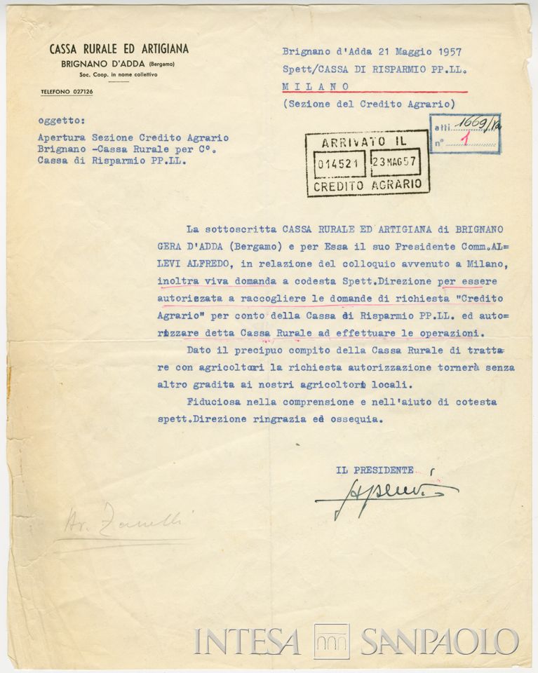 - Archivio Storico Intesa Sanpaolo, patrimonio archivistico Cariplo, Fondo 9 "Sezione di Credito Agrario", Serie 15 "Varie", faldone 33, fasc. 10 "Cassa Rurale ed Artigiana Brignano Gera d'Adda", Convenzione tra la Cassa Rurale ed Artigiana di Brignano Gera d'Adda e la Cariplo, 27 luglio 1957;